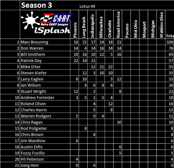 Of the 8 starters, only 4 made it to the finish, proving that sticking around earns points. Breuning kept it up front followed by Bill Smithem, Don Warren and Larry Eaglen, with Ragan scoring 5th place points despite not making it to the end.