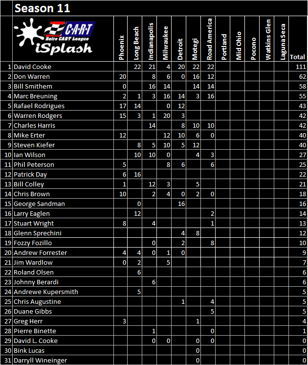 | Driver | Finish | Start | Fastest | Incidents | Points |
