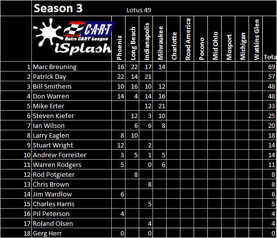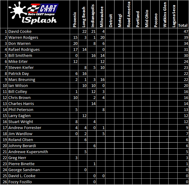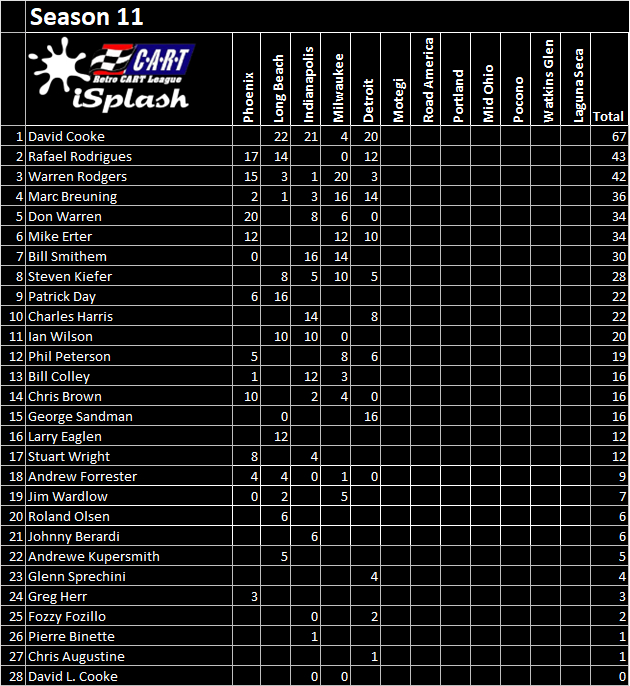 George Sandman started the Detroit GP from the pole and led most of the way, with Cooke and Breuning following in basically the grid order; Breuning started dropping off quickly but maintained his position ahead of Rafael Rodrigues. Sandman pitted earliest of the leaders, but when it was all said and done, it was David Cooke leading Sandman. Cooke took the checkered 7 seconds ahead of Sandman, with Breuning 3rd, Rodrigues 4th and Mike Erter in 5th.