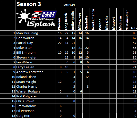 | Driver | Finish | Start | Fastest | Incidents | Points |