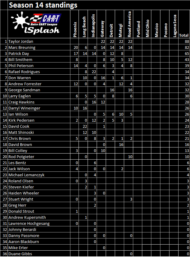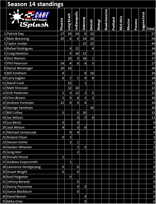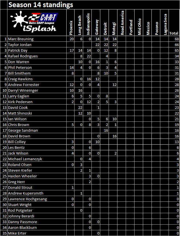 | Driver | Finish | Start | Fastest | Incidents | Points |