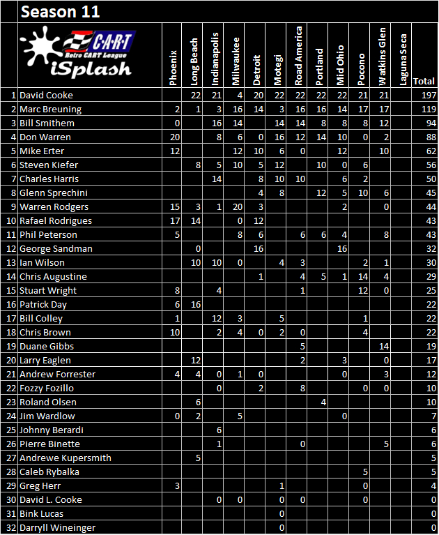 David Cooke is our Season 11 Champion. He won an impressive 10 races, the final 8 of them consecutively. Congratulations to him!