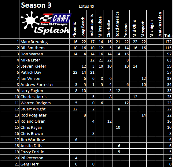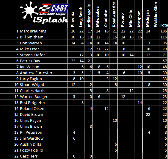 Bill Smithem started from the pole and never looked back at the season finale at Watkins Glen, leading every lap and saving fuel as best he could. He came over the finish line with a sputtering engine, as did 2nd placed Breuning. Both leading cars were the only ones not to pit for fuel, which brought Breunign back from 5th to 2nd after a lap one spin. Stuart Wright grabbed 3rd place, followed by Ian Wilson and Pierre “PappaBinz” Binette.