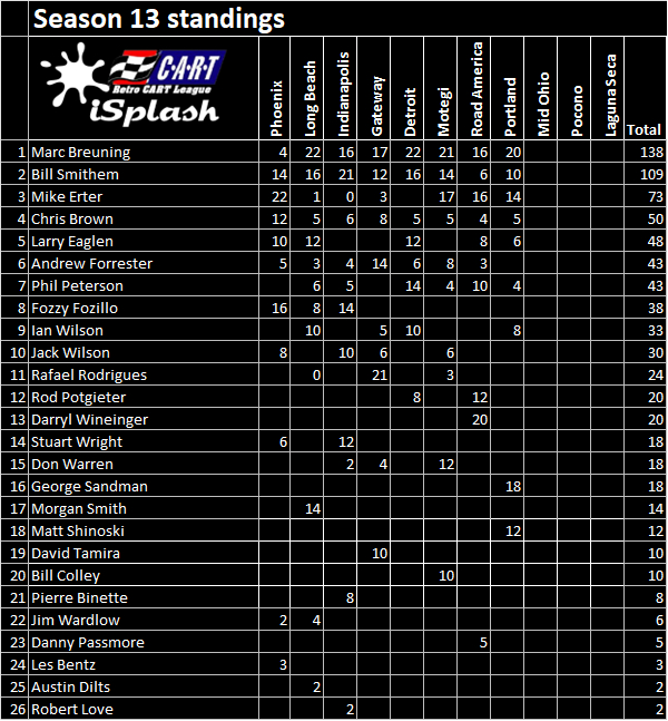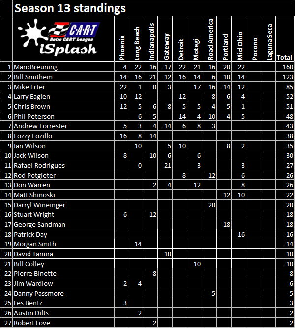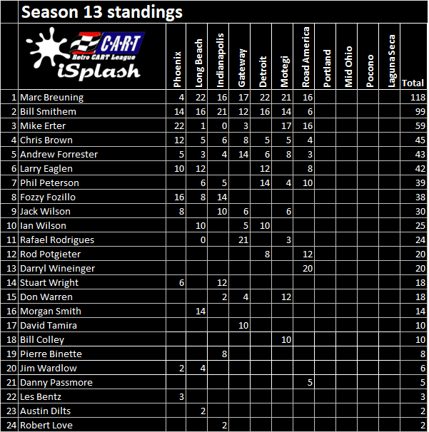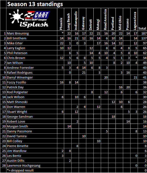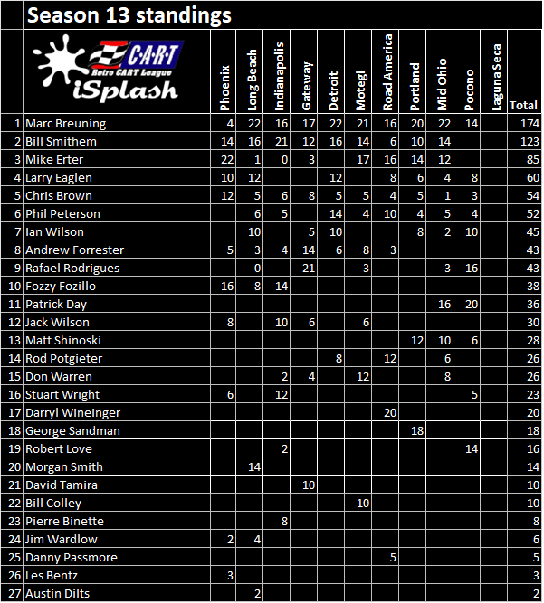 Breuning wins the Season 13 championship, with Bill Smithem 2nd and Mike Erter 3rd.